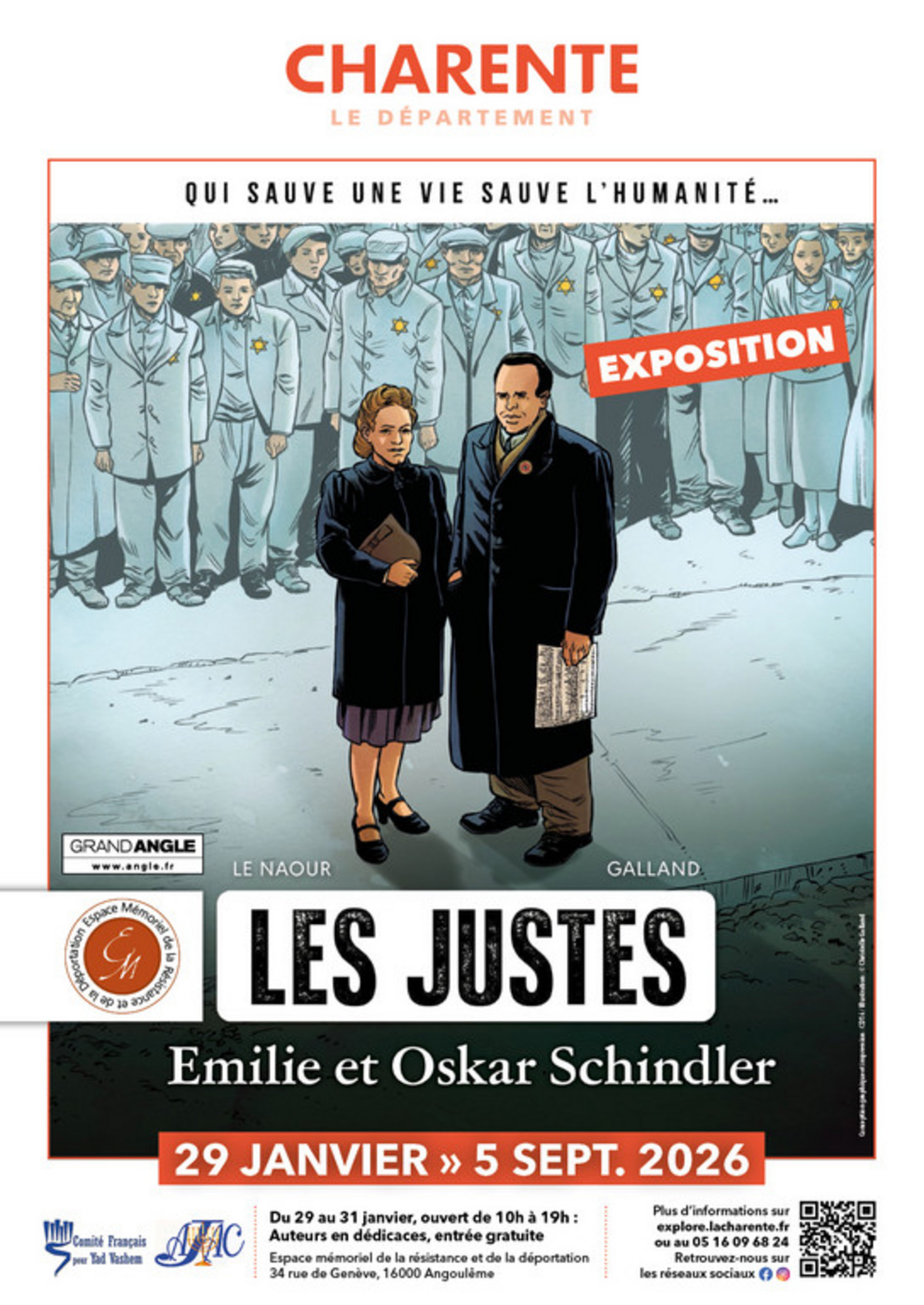 À l’occasion du Grand Off de la bande dessinée, le Département de la Charente vous invite à découvrir l’exposition « Emilie et Oskar Schindler » du jeudi 29 au samedi 31 janvier, de 10h à 19h, à l’Espace Mémoriel de la Résistance et de la Déportation d’Angoulême.