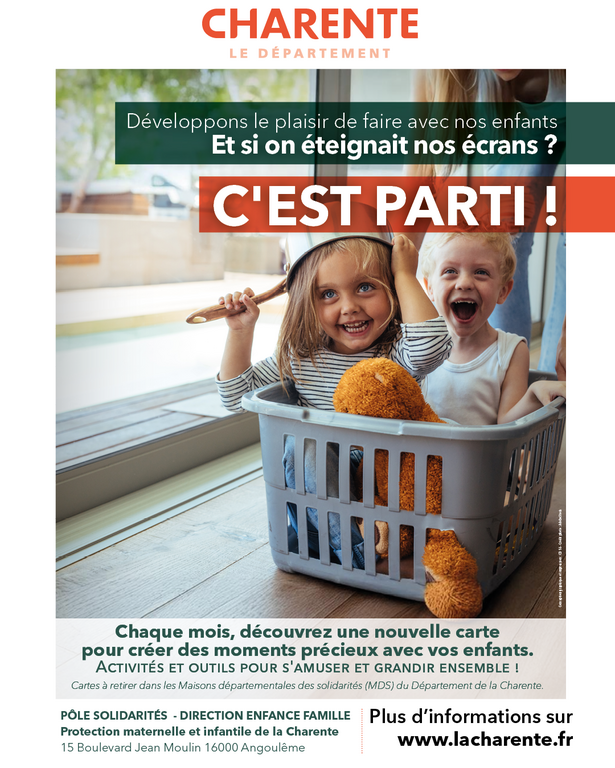 Pour accompagner les parents mais aussi l’ensemble des professionnels engagés auprès des enfants, le Département de la Charente organise du 15 au 19 septembre 2025 une semaine sans écran. Cette semaine doit-nous interroger dans notre quotidien d’adulte et permettre une prise de conscience collective sur notre rapport aux écrans.
