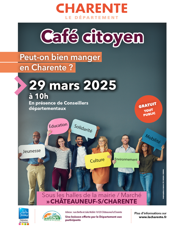 Partager cette page Partager Imprimer Facebook Twitter Linkedin Actualité Ce mois Mois précédent mars Mois suivant Café citoyen - La mobilité nous permet-elle de… 04 mars Retour en images sur le Café citoyen qui a eu lieu à Bonnes ! Les participants ont pu échanger et… Lire la suite Journée internationale de lutte pour les droits… 08 mars Le samedi 8 mars Salle des fêtes de Montbron, Rue la Chapelle des Lépreux, 16220 Montbron De 10h30… Lire la suite Café citoyen - Peut-on bien manger en Charente ? 29 mars Vous souhaitez vous exprimer et répondre à cette question ? Participez au Café Citoyen et rejoignez… Lire la suite