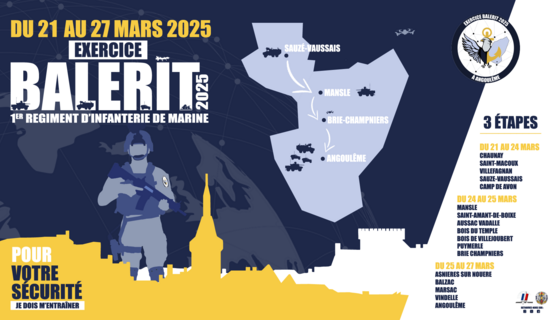 Exercice du 1er RIMa en Charente 24/03/2025 - Générale Du 21 au 27 mars, le 1er régiment d’infanterie de marine (1er RIMa) conduira un exercice en terrain ...