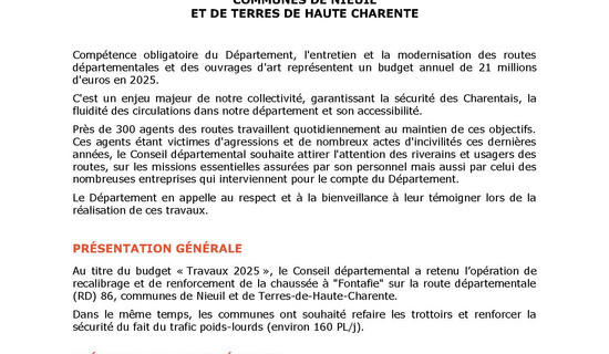 Travaux - Communes de Nieuil et de Terres de Haute Charente - RD 86 20/10/2025 - Routes et déplacements Compétence obligatoire du Département, l'entretien et la modernisation des routes départementales et ...