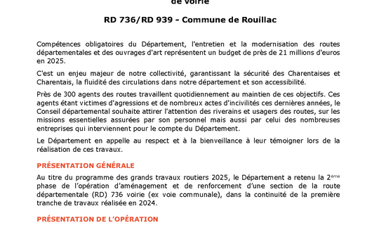 Contournement ouest de Rouillac : Aménagement et renforcement de voirie 30/08/2025 - Routes et déplacements Compétences obligatoires du Département, l'entretien et la modernisation des routes départementales ...
