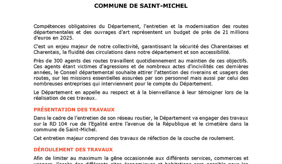 TRAVAUX DE RÉFECTION DE LA COUCHE DE ROULEMENT RD 104 - COMMUNE DE SAINT-MICHEL 14/08/2025 - Routes et déplacements Compétences obligatoires du Département, l'entretien et la modernisation des routes départementales ...