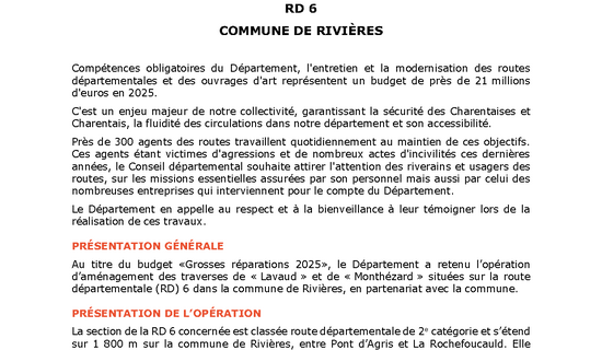 Aménagement des traverses de Lavaud et de Monthézard RD 6 - Commune de Rivières 05/09/2025 - Routes et déplacements, ... Compétences obligatoires du Département, l'entretien et la modernisation des routes départementales ...