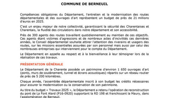 TRAVAUX DE RECONSTRUCTION DU PONT DE FONT ALARD RD 198 - COMMUNE DE BERNEUIL 20/08/2025 - Routes et déplacements Compétences obligatoires du Département, l'entretien et la modernisation des routes départementales ...