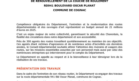 Travaux - Commune de Cognac - RD 941 20/10/2025 - Routes et déplacements Compétence obligatoire du Département, l'entretien et la modernisation des routes départementales et ...
