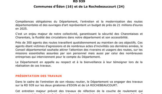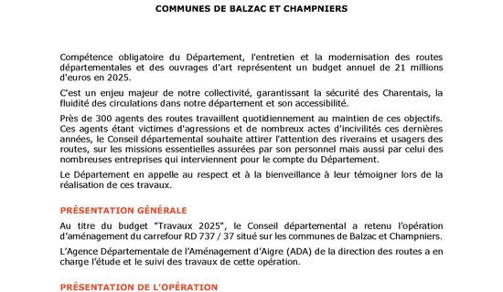 Travaux - RD 737/37 à Balzac et Champniers 14/11/2025 - Routes et déplacements Compétence obligatoire du Département, l'entretien et la modernisation des routes départementales et ...