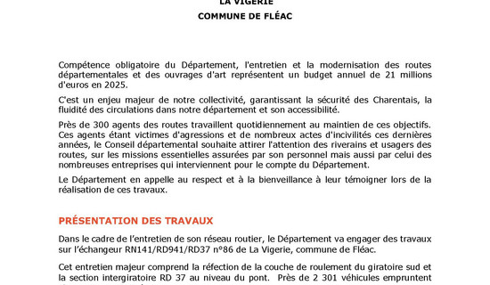 Travaux - Commune de Fléac - RD 141 24/10/2025 - Routes et déplacements Compétence obligatoire du Département, l'entretien et la modernisation des routes départementales et ...