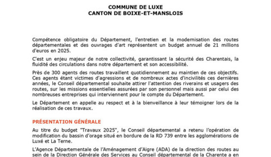 Travaux - Commune de Luxé - RD 739 27/10/2025 - Routes et déplacements Compétence obligatoire du Département, l'entretien et la modernisation des routes départementales et ...