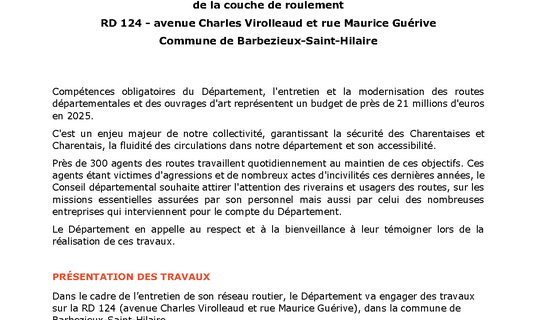 Travaux de renforcement de chaussée et de réfection de la couche de roulement RD 124 - Commune de Barbezieux-Saint-Hilaire 05/09/2025 - Routes et déplacements, ... Compétences obligatoires du Département, l'entretien et la modernisation des routes départementales ...