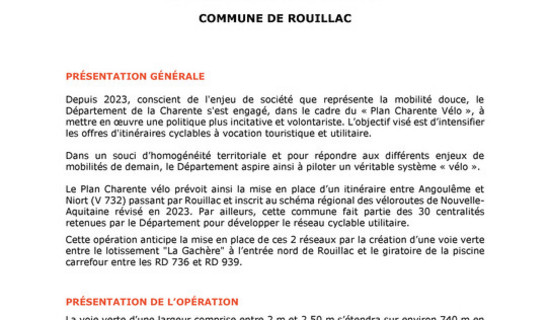 Création d’une voie douce entre le lotissement "La Gachere" et le giratoire de la piscine en passant par le collège le long de la RD 736 - Commune de Rouillac 22/04/2025 - Déplacements Depuis 2023, conscient de l'enjeu de société que représente la mobilité douce, le Département de la ...